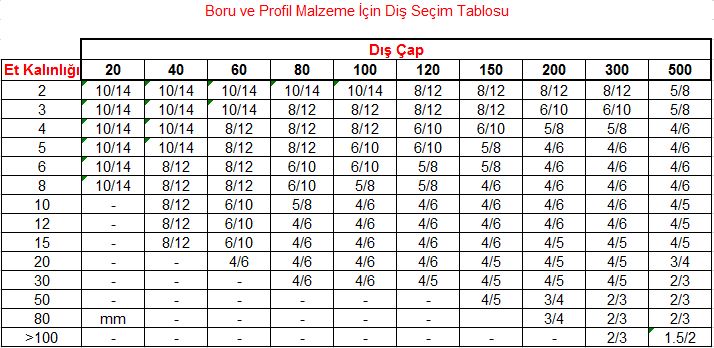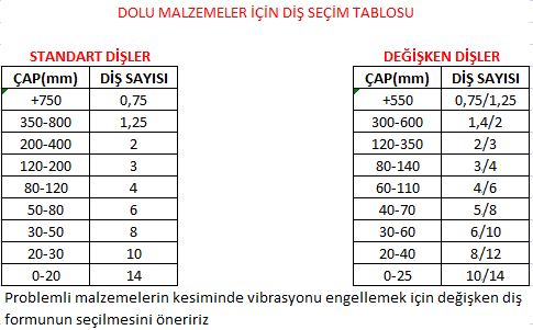 Bi-Metal Şerit Testere Diş Seçim Tablosu
